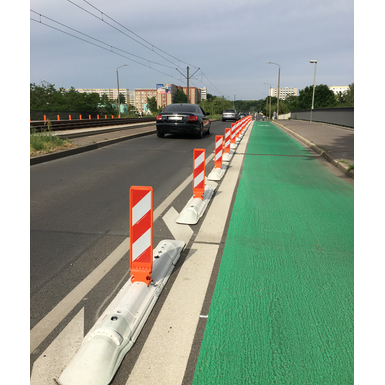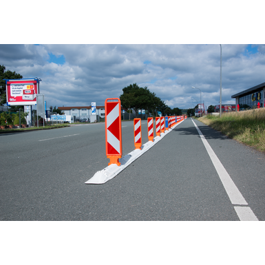 The lateral guide rails - climbing edges - ensure that the seperator is firmly pressed to the ground by the weight of the vehicle passing or running over it. Our Guide curbs can be equipped with Leitboys or markers of different sizes and design, as well as with Leitboy bollards.